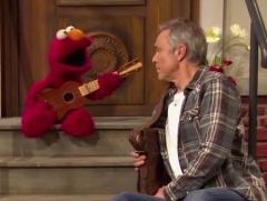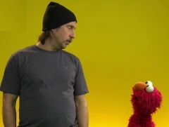 Der Schauspieler Hannes Jaenicke verhalt Elmo zu mehr Mut beim Singen. |