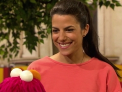 Martina Hill war in der Sesamstraße zu Gast, um das Wort "tollpatschig" zu erläutern. |