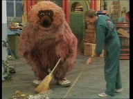 Samson und Schorsch fegen den Hof. Buh nimmt das zum Anlass, endlich mal seine Baumwohnung auszumisten. |