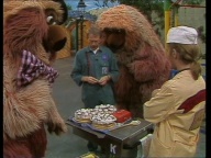 Samson und Simson streiten sich aufgeregt darum, wer am meisten von den gekauften Torten bekommt. Schorsch hat alle Mühe, den Streit zu schlichten. |