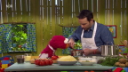 Elmo und Steffen Henssler kochen für Krümel - ob das gut geht? Außerdem reißt Ernie Bert aus dem Schlaf, um übers Frühstück zu singen. Steinzeitmenschen hatten keinen Kühlschrank, sondern mussten für ihr Essen auf die Jagd gehen. So, wie Mia (9) und Noah (9) es versuchen. Ferner erklärt Grobi zusammen mit Steffen Henssler, was ein Koch so macht und Krümelmonster lernt, welche Lebensmittel man nur manchmal essen darf. Schließlich entdecken Wisch und Mop eine Einkaufstüte mit Obst und Gemüse. |