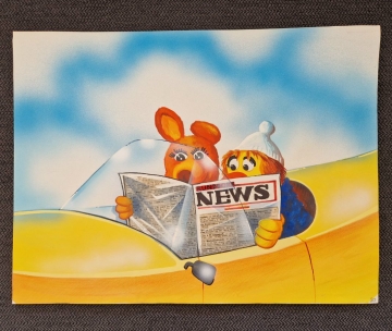 "Max & Molly" Original-Gemälde aus den 80er Jahren von Johannes Saurer mit geklebten Zeitungsausschnitten. |