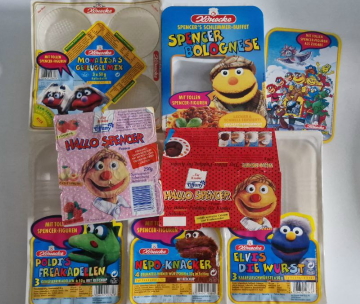 Prototypen der "Hallo Spencer" Könnecke-Wurstverpackungen und der Tiffany-Joghurtverpackungen. |