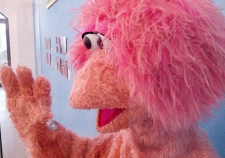 Fotos aus verschiedenen Jahren der Sesamstraße hingen an den Wänden.