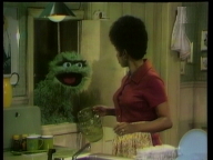 Oscar lässt sich von Susanne allte Zutaten für seine speziellen Kekse geben. Krümelmonster darf sie kosten. |