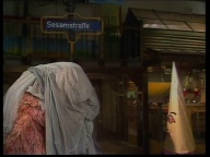 Samson und Tiffy wollen Henning und Lilo als Gespenster erschrecken. Leider erschrecken sie sich zunächst vor sich selbst. |