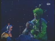 Abendstimmung in der Sesamstraße. Finchen und Samson treffen heute auf den Sandmann. Besonders von seiner schönen Saxophonmusik sind sie begeistert. |