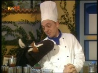 Pferd freut sich, dass Starkoch Thorsten Topf ihm etwas kochen will. Rumpel meint aber, noch besser kochen zu können.