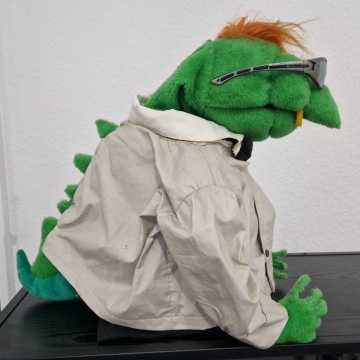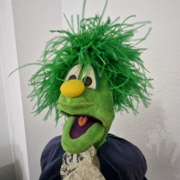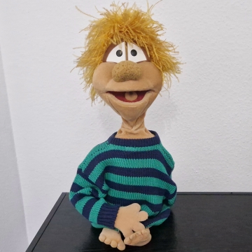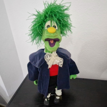 Willkommen Kasi! Diese Originalpuppe aus den ersten 59 "Hallo Spencer"-Folgen der Jahre 1979 bis 1984 hat Fernsehgeschichte geschrieben. Er sang das berühmte Fahrstuhllied, verteilte Gummibärchen und fürchtete sich vor Nero. Gespielt wurde Kasi vom viel zu früh verstorbenen Herbert Langemann. Unforgettable. Die Nase nach 45 Jahren nicht mehr perfekt, ansonsten ist die Figur jedoch erstaunlich gut erhalten.